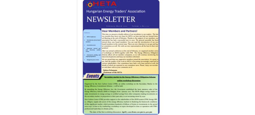 Read moreOn 25 February 2021, due to the coronavirus, the IX. Annual Conference of the Hungarian Energy Traders Associations' was held online. 441 people registered for the event. The conference was opened by the chairman of the HETA, Balázs Felsmann, hosted by ...